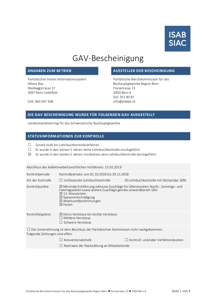 Bei gewissen Bauprojekten müssen ausführende Firmen einen Nachweis erbringen, dass sie die GAV-Bestimmungen einhalten. Bisher stellt die SPBH dafür GAV-Bescheinigungen aus. Ab diesem Sommer wird dieses Dokument jedoch ausschliesslich über die ISAB-Plattform erhältlich sein.