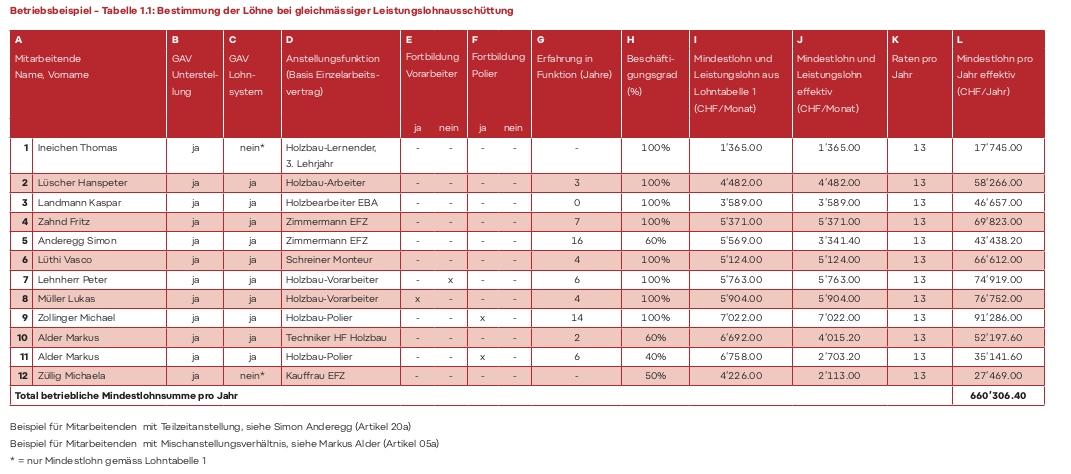 Die gleichmässige Ausschüttung der betrieblichen Leistungslohnsumme (inkl. Mindestlohn) erfolgt gemäss Lohntabelle 1.
