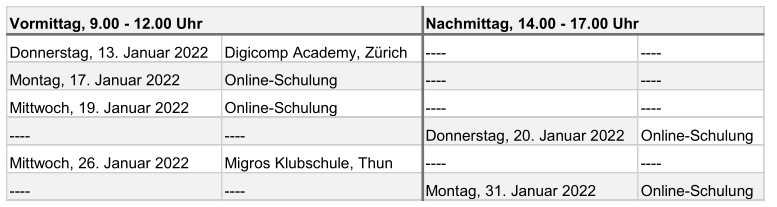 Die Schulung dauert rund 3 Stunden. Sie haben die Möglichkeit jeweils vormittags von 09.00 – 12.00 Uhr oder nachmittags von 14.00 – 17.00 Uhr teilzunehmen.