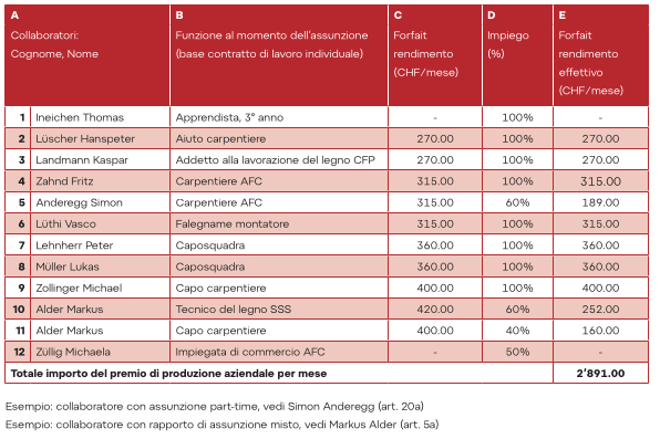 | 4 | Determinare con la tabella salariale 3 l'importo del premio di produzione aziendale (somma dei forfait dei collaboratori (esempio aziendale - tabella 2.2, colonne da C a E). | Art. 28d |