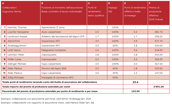 | 5 | Valutare il rendimento individuale dei collaboratori secondo il modulo di valutazione dei collaboratori del Appendice 3 del CCL (esempio aziendale - valutazione dei collaboratori). Suddividere poi l'importo del premio di produzione aziendale per il totale dei punti di tutti i collaboratori e calcolare così il salario per ogni punto di produzione. In seguito l'importo del premio di produzione va ripartito sui suoi collaboratori in base al punteggio risultante dalla qualifica del collaboratore (esempio aziendale - tabella 2.3, colonne da C a F). | Appendice 3 del CCL |