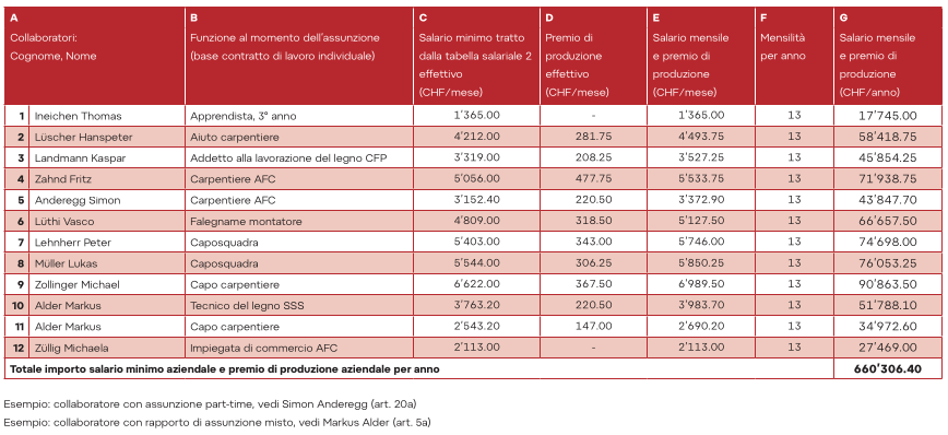 Fase di lavoro D: determinare i salari mensili minimi dei collaboratori (salari minimi della tabella salariale 2, più premio di produzione).