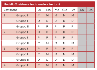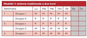 M = Turno di mattina (p.es. ore 6 – 15, pause incl).